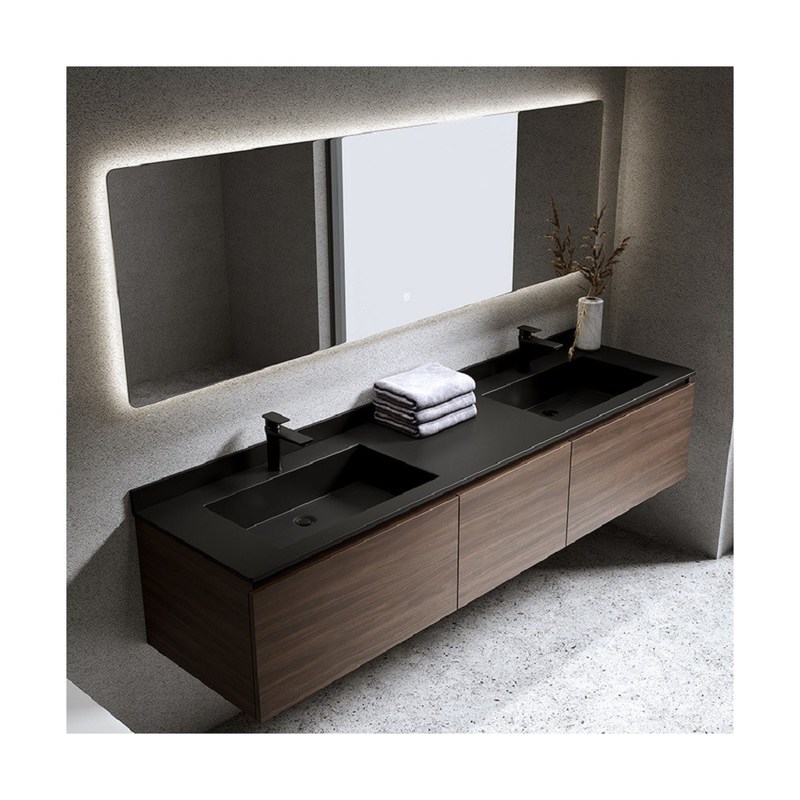 욕실 바니티는 스타일리시한 벽에 장착 된 두 배 싱크 바니티를 소개합니다. 0